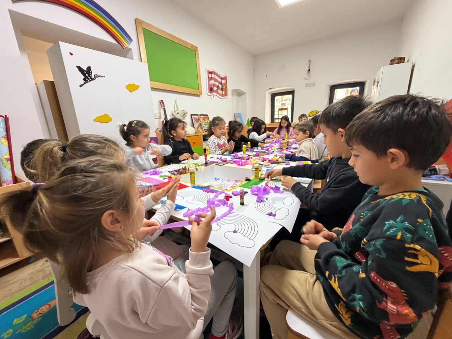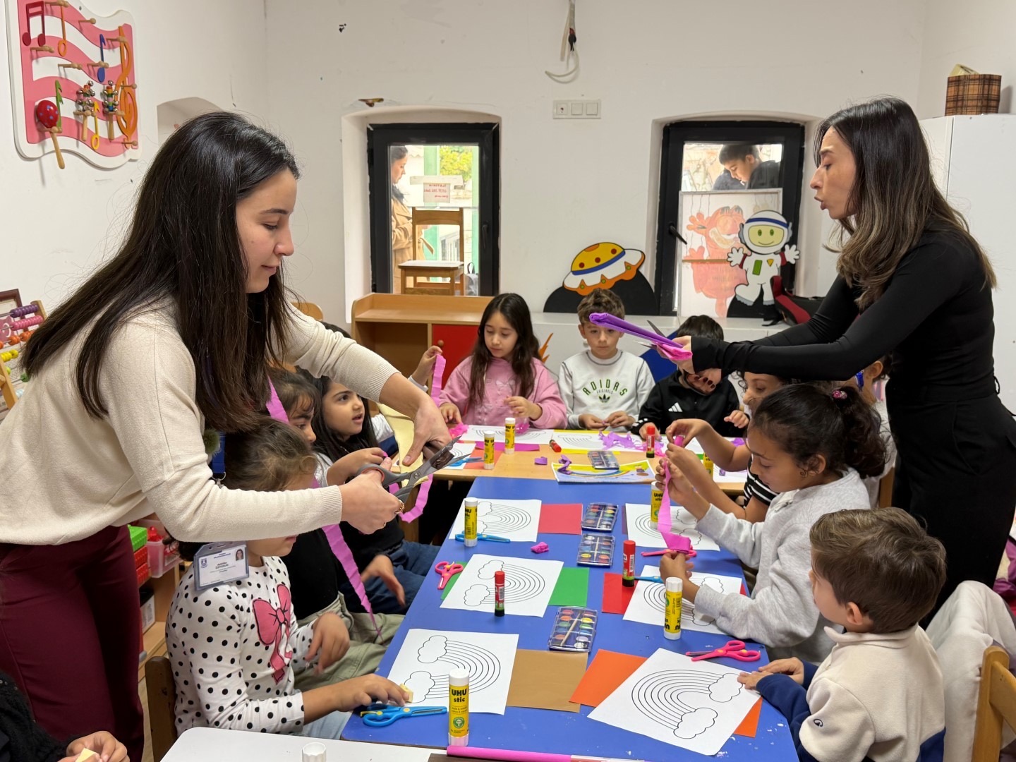 Kadın ve Aile Hizmetleri Müdürlüğü’nde görevli eğitmen Büşra Yabacı tarafından yürütülen atölyede çocuklar, renkli krapon kâğıtlarından gökkuşağı, pamuktan ise bulutlar yaparak yaratıcılıklarını ortaya koydu.